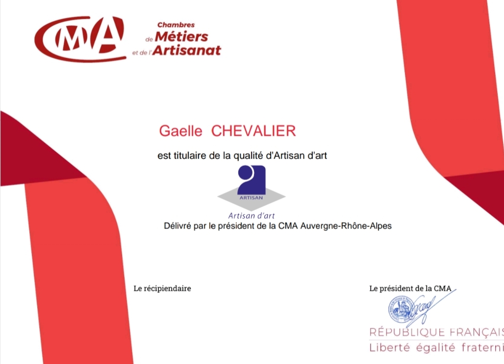 RECONNAISSANCE OFFICIELLE Obtention du label Artisan d’Art. Une distinction qui valorise la maîtrise des techniques et l’excellence de l’artisanat Français. Une belle reconnaissance du savoir-faire, de la passion et de l’exigence que Gaëlle met chaque jour dans ses créations.