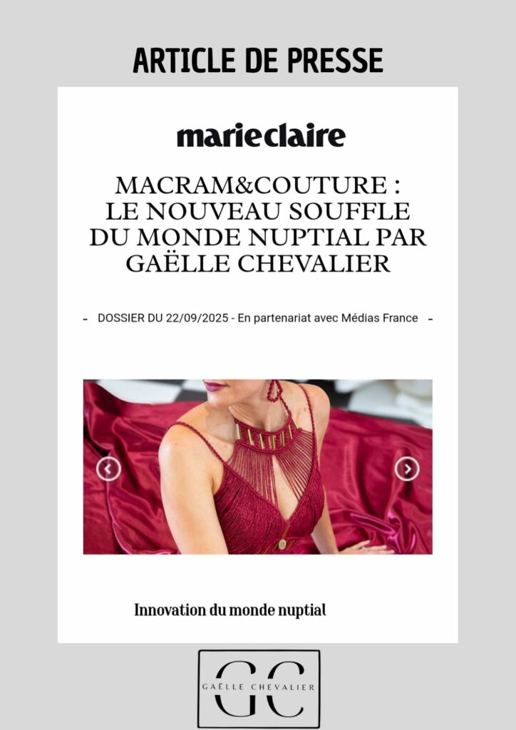Cet article marque une étape importante pour Gaëlle Chevalier Macram&Couture, avec une parution remarquée dans Madame Figaro. Le prestigieux magazine met à l'honneur l' univers singulier et raffiné de la créatrice, qui revisité l'art de la robe de mariée et de cocktail à travers un subtil mariage de macramé et de haute couture.