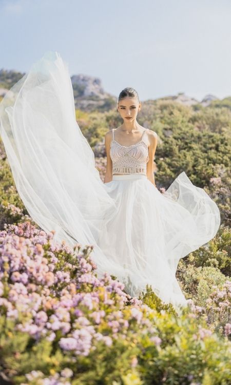 Absolument. La robe peut être modulable : haut macramé coloré et jupe courte pour le civil, puis jupe longue fluide pour la cérémonie. Les mêmes teintes pastel se déclinent sur plusieurs silhouettes.