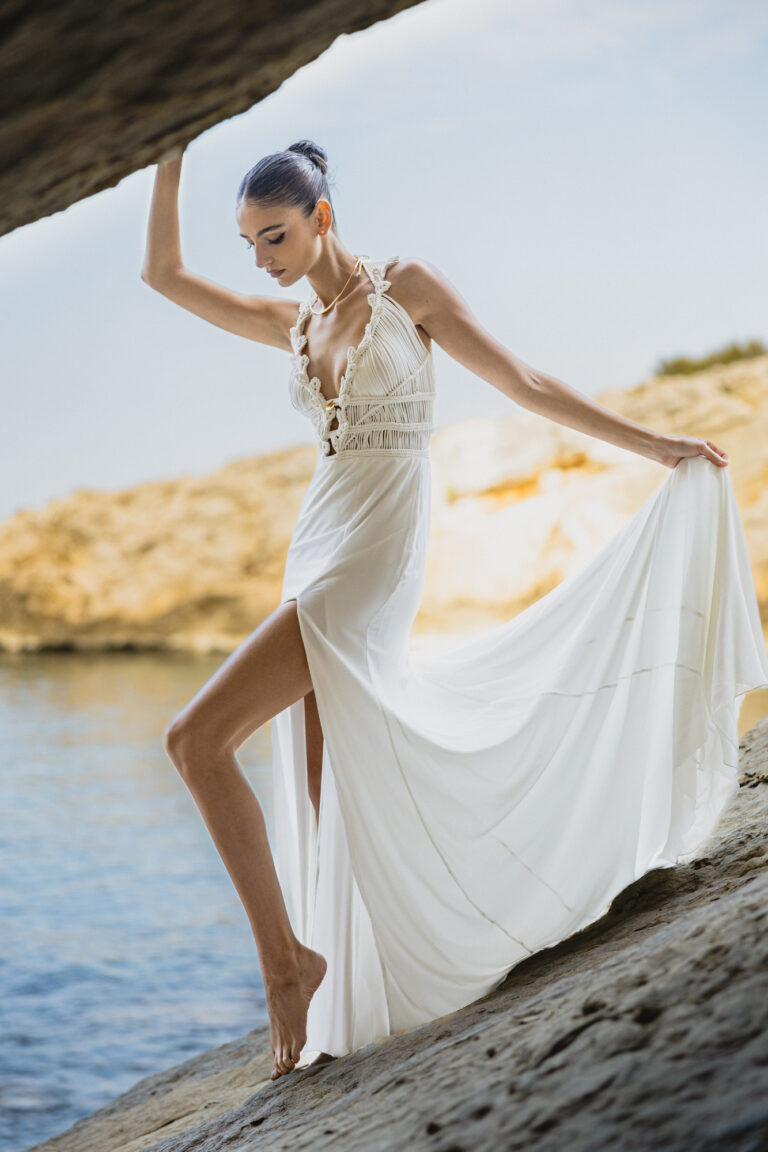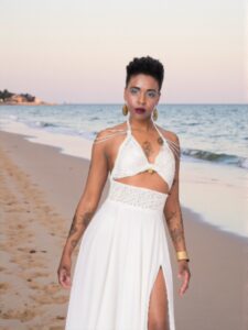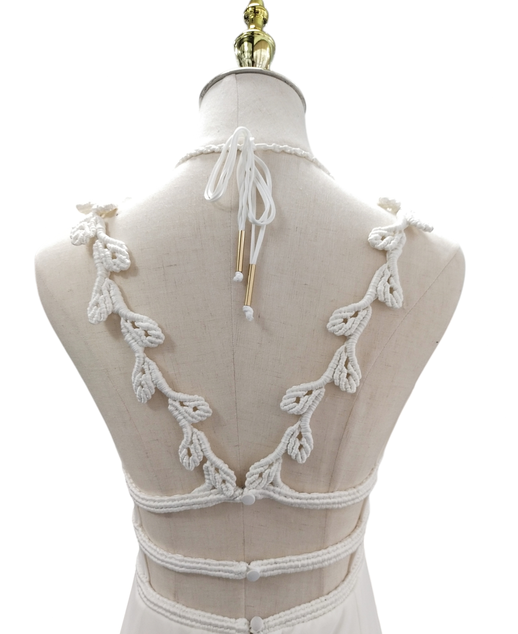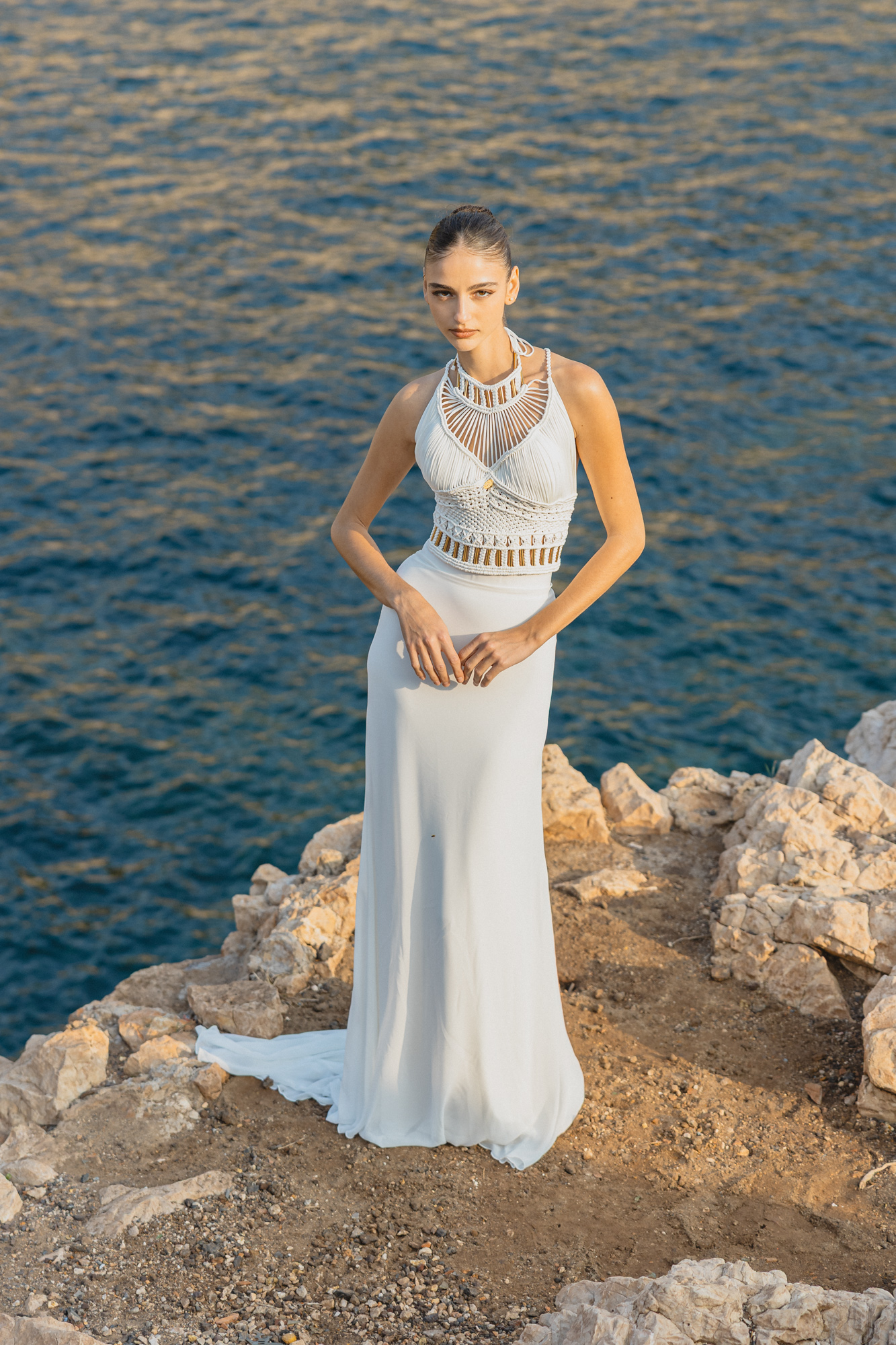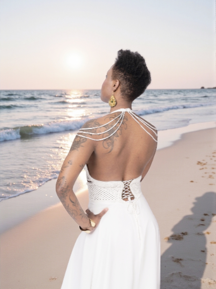 Éclosion incarne la naissance d’une femme libre, solaire et affirmée. Chaque robe est pensée comme une fleur rare qui s’ouvre lentement, révélant sa beauté unique à travers les nœuds délicats du macramé et les lignes précises de la couture artisanale.