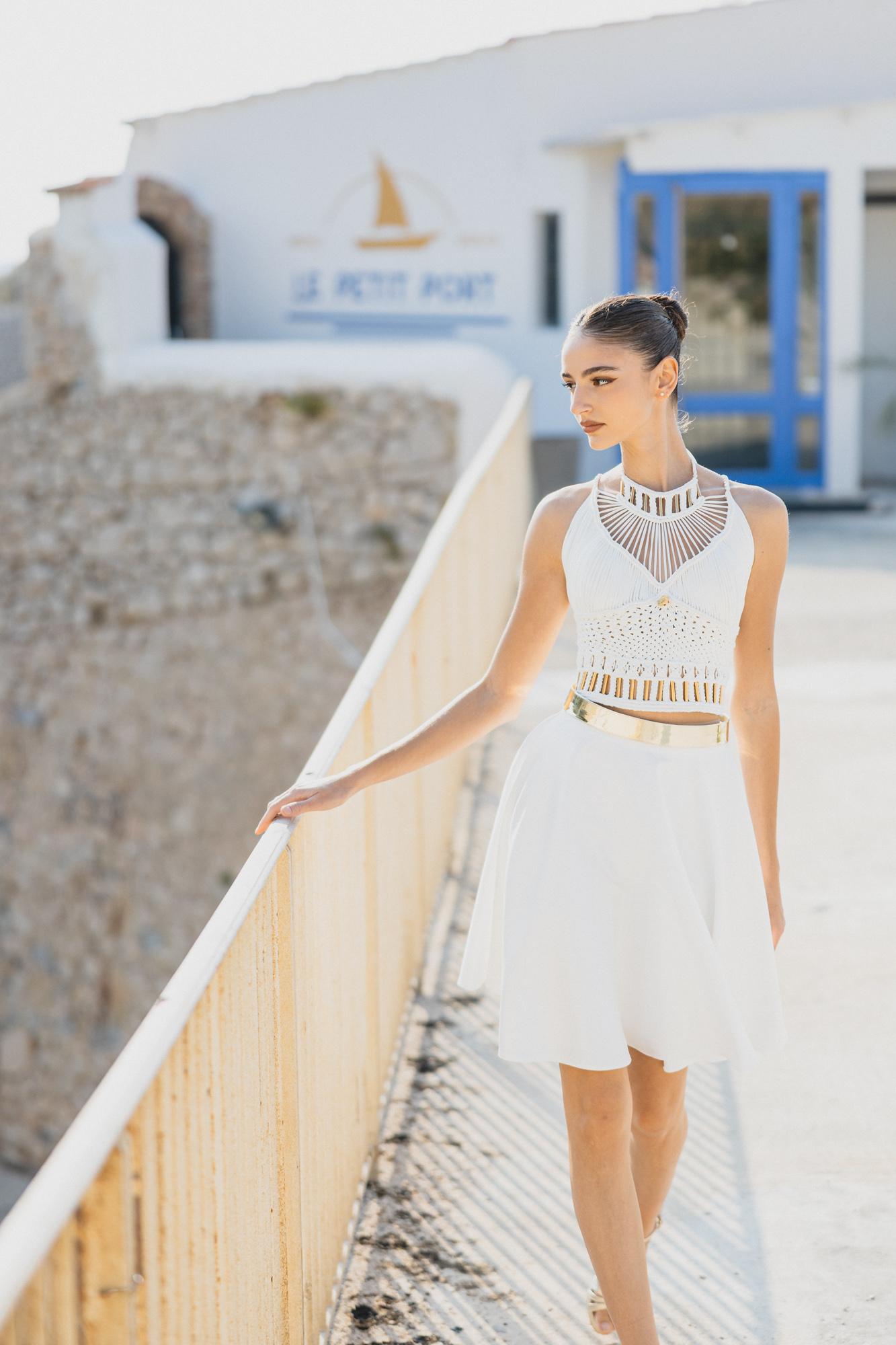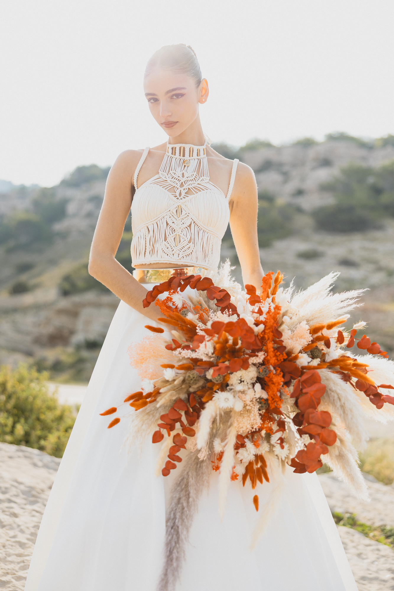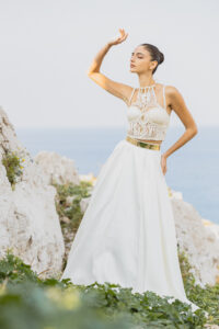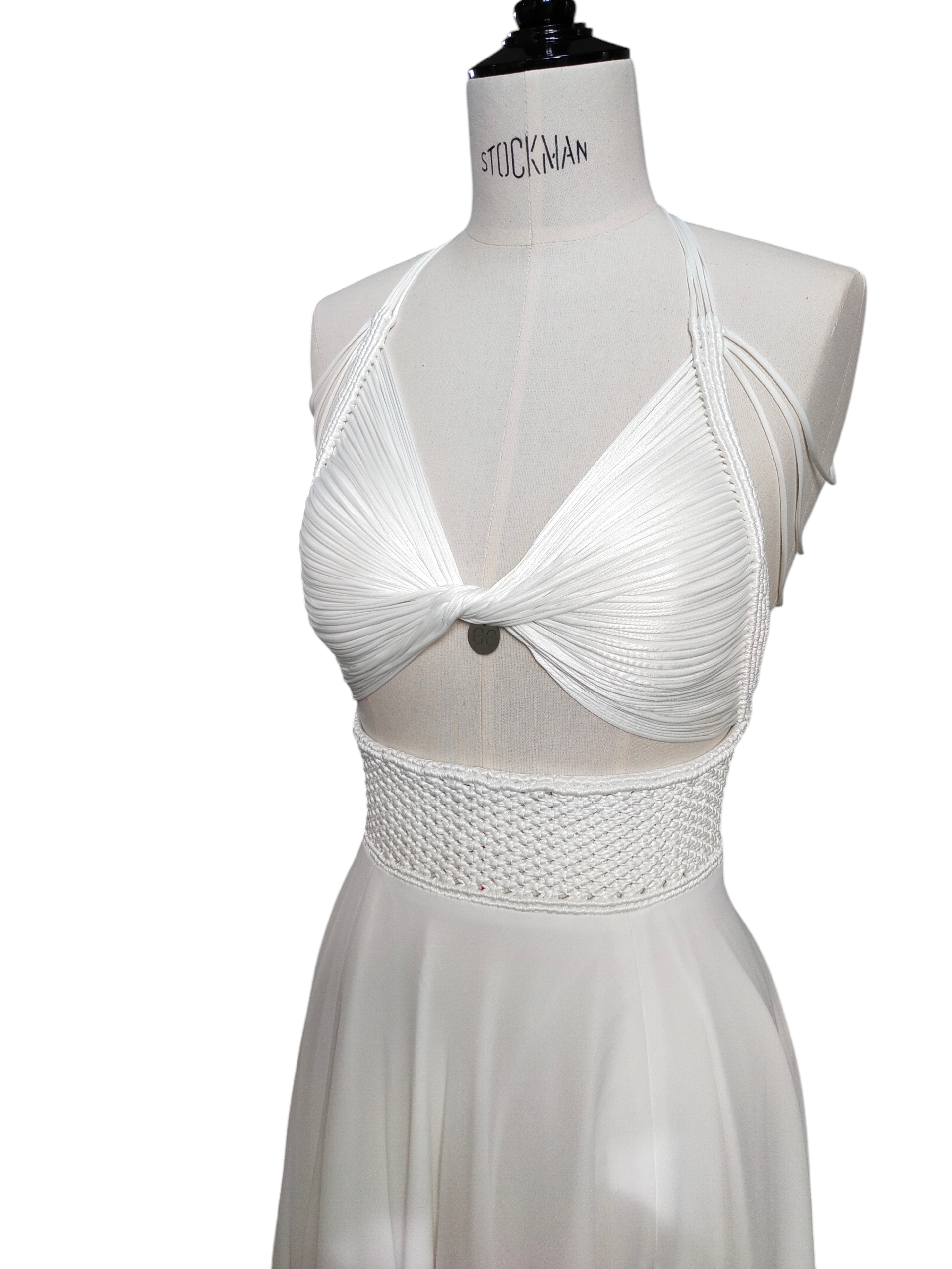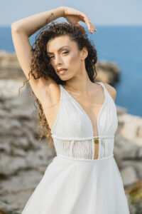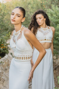 Éclosion incarne la naissance d’une femme libre, solaire et affirmée. Chaque robe est pensée comme une fleur rare qui s’ouvre lentement, révélant sa beauté unique à travers les nœuds délicats du macramé et les lignes précises de la couture artisanale.