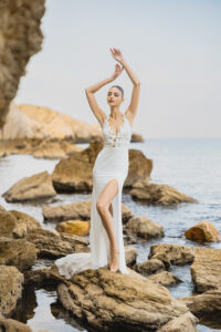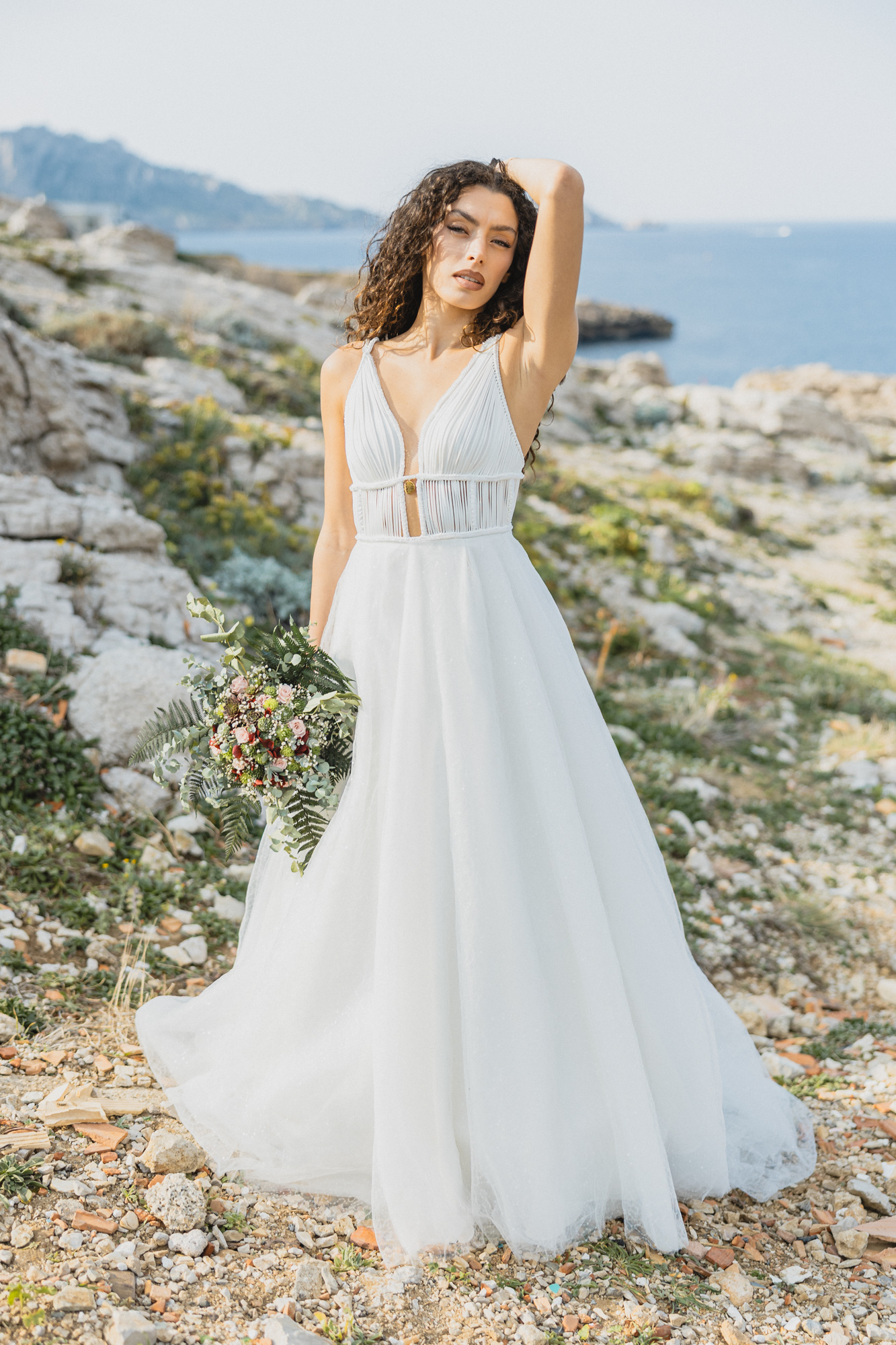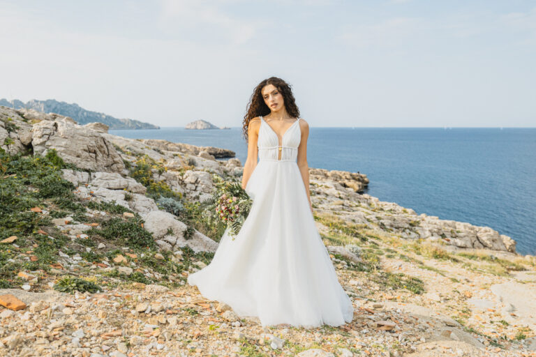 Cette collection célèbre le moment de transformation – celui où la mariée quitte le cocon de l’attente pour embrasser pleinement sa lumière. Les textures naturelles, les jeux de transparence et les volumes subtils traduisent un renouveau, une élévation, une renaissance.